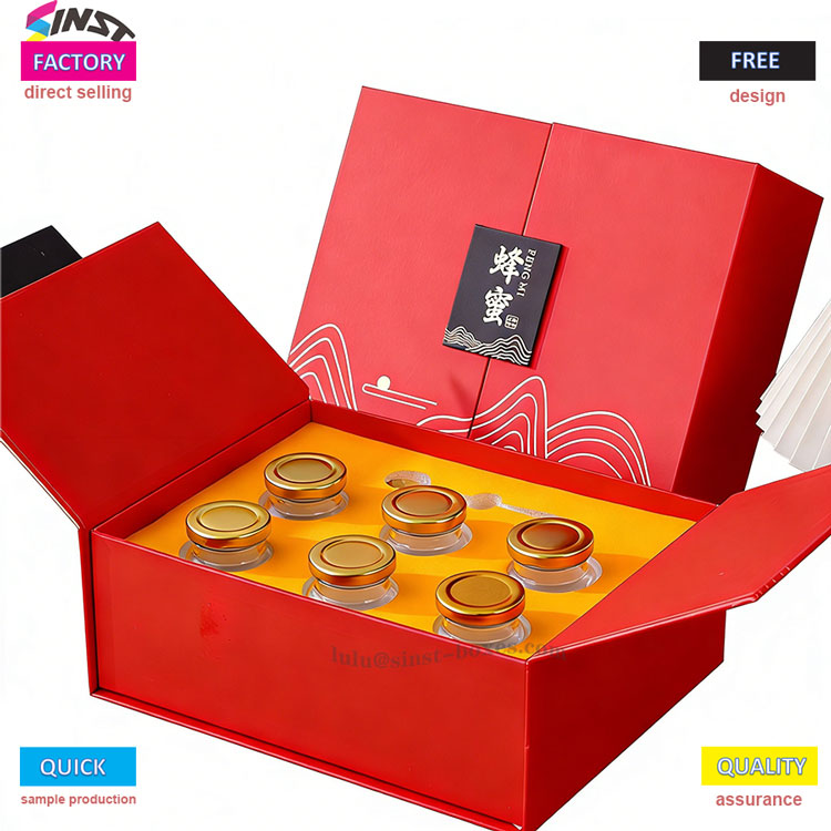Şok emici astarlı bu kırmızı altın Bal hediye kutusu, cam bal kavanozunu sıkıca sabitleyebilir ve nakliye çarpışmalarını önleyebilir. Bal hediye kutusu, iş ziyaretleri, tatil hediyeleri ve hediyelik eşyalar dahil tüm durumlar için uygundur ve logo özelleştirmesini destekler. İster tek bir kutu üst düzey bal, ister birden fazla kutu balın birleşimi olsun, kolaylıkla taşınabilir, bu da onu dış ticaret tüccarlarının ürün primlerini artırmaları için uygun maliyetli bir seçim haline getirir.