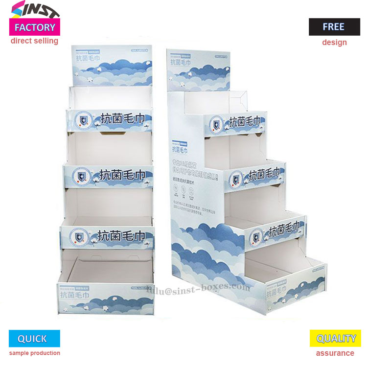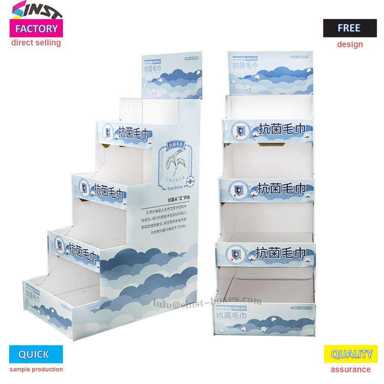 Bu Havlu Karton Teşhir Rafı, saf beyaz tabanı, mavi ve beyaz bulutları ve üzerine basılmış küçük çiçek baskılarıyla havlu kategorisi için özel olarak özelleştirilmiştir ve havluların "cilt dostu ve temiz" olan temel özelliklerine mükemmel şekilde uyan ferahlatıcı bir his sağlar; Bağımsız bir depolama alanına sahip kademeli üç katmanlı yapı, mendillerin, yüz havlularının ve taşınabilir eşyaların kolay erişim için kolayca sınıflandırılmasına ve yerleştirilmesine olanak tanır.