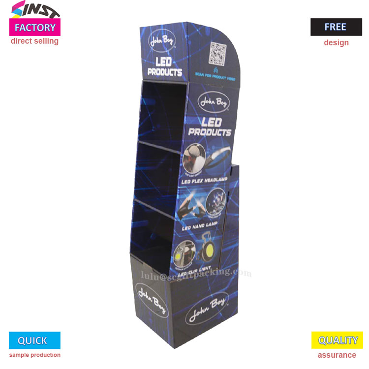 LED ürün oluklu karton ekran rafı, özellikle küçük boyutta ve çok çeşitli ürünlere sahip LED aydınlatma armatürleri için tasarlanmıştır. Teknoloji ve sadelik duygusunu birleştiren mavi çizgilerle derin mavi ve siyah bir ana renk şemasına sahiptir; Her katman LED farları, LED el fenerlerini, LED klips ışıklarını vb. Düz bir şekilde görüntüleyebilir ve açık tasarım, ürünlerin süpermarket aydınlatmasının "sahne tabanlı ekran" ihtiyaçlarına uyum sağlayarak engelsiz görüntülenmesine izin verir.
