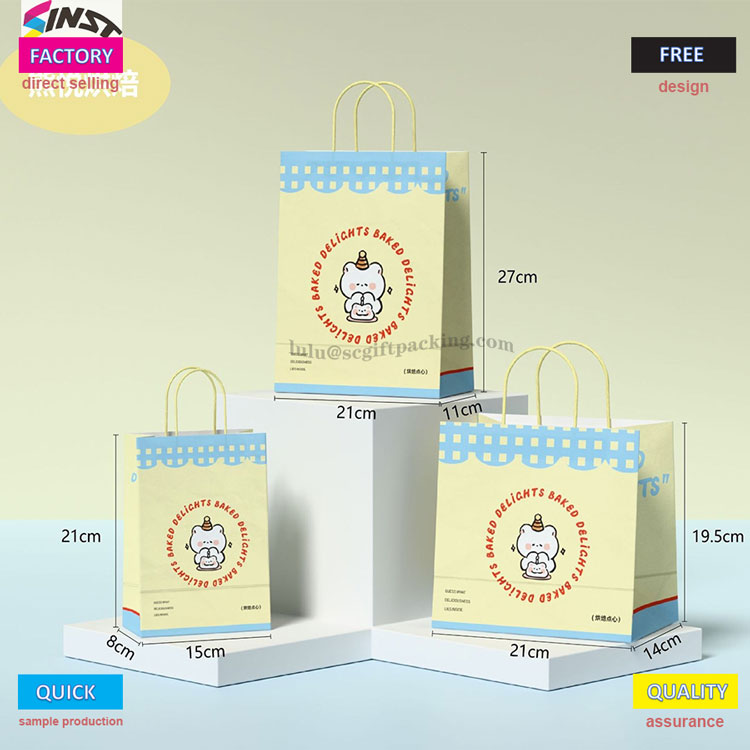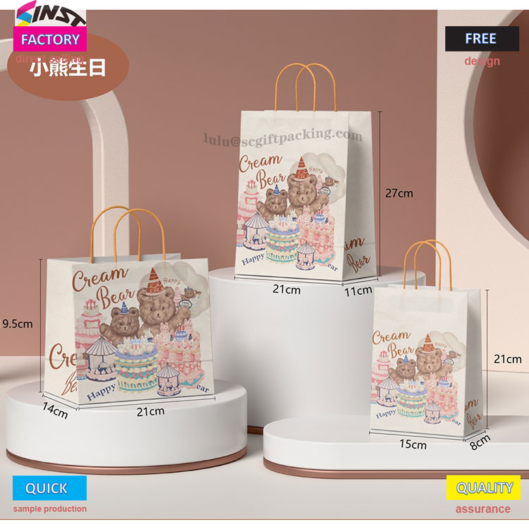 Son zamanlarda,Sinst Ambalaj Şirketi bir hediye çantası başlattı"Bear doğum günü" temasıyla. Çanta, sadece kağıt torbanın çevre dostu dokusunu korumakla kalmayıp, aynı zamanda doğum günü atmosferini parlak renklerle aktaran sıcak sarı saplı bir ip ile eşleştirilmiş elle çizilmiş çizgi film ayı ve kek desenleri ile basılmıştır. Bu çanta, bir aile toplantısı veya perakende mağazası olsun, yumurta kekleri, oyuncaklar, hediye kutuları vb. Gibi çeşitli hediyeler için uygundur, temel ambalaj ihtiyaçlarını karşılayabilir.