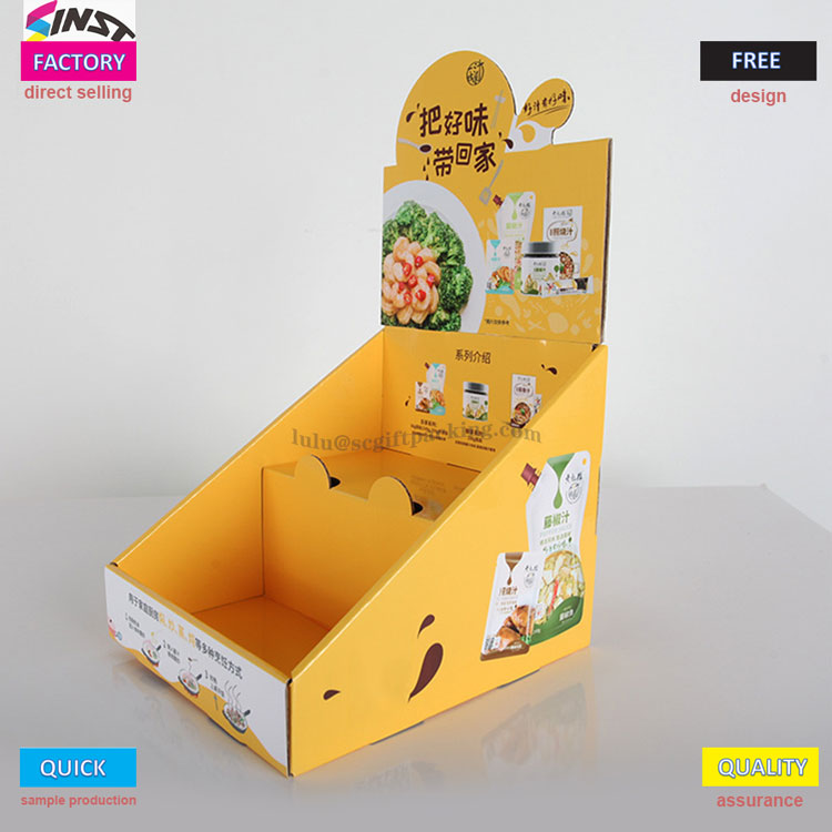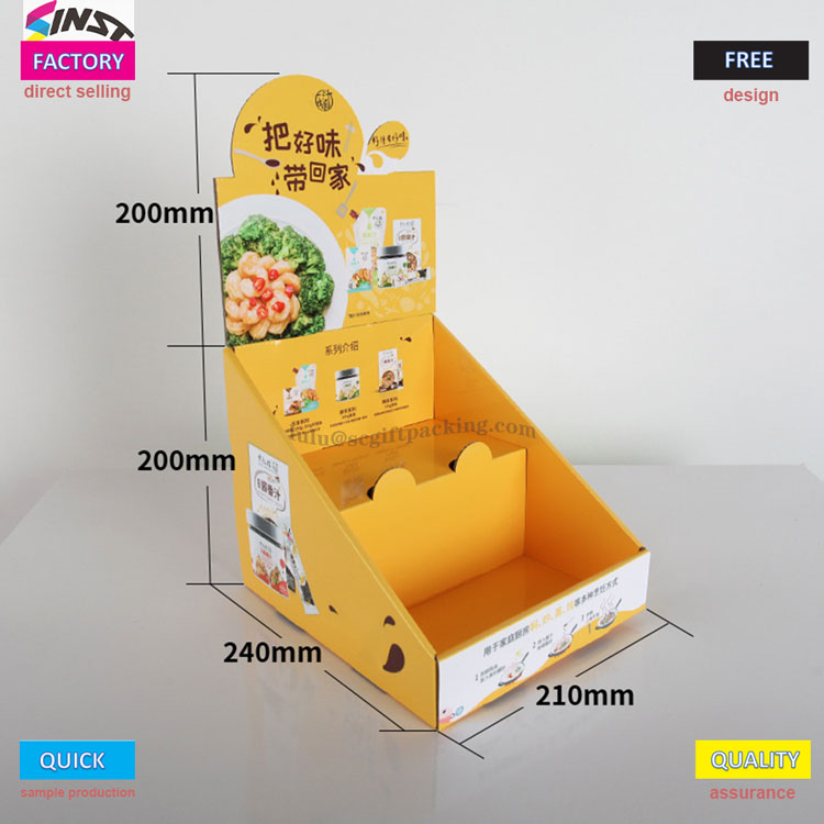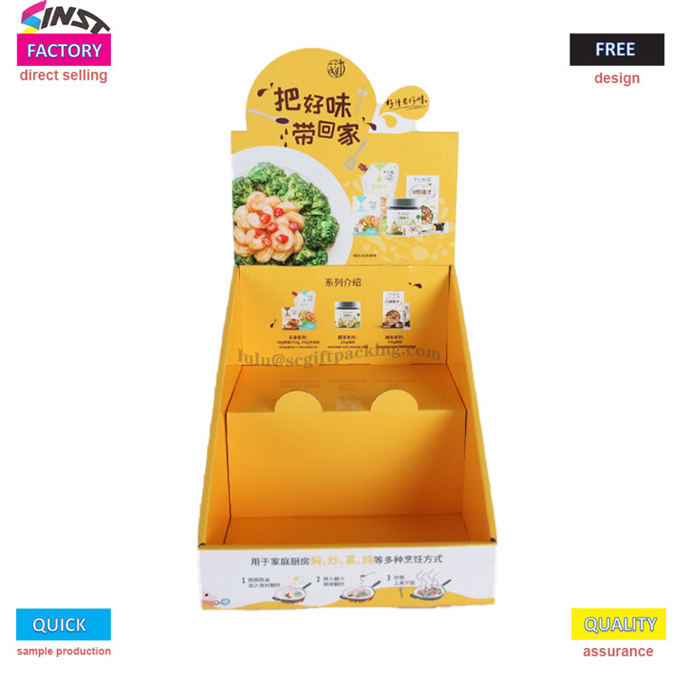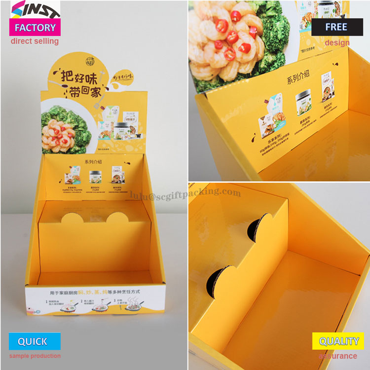 Bu, biber ekran kutusu, tuz ekran kutusu, tavuk özü ekran kutusu vb. Olabilen bir süpermarket baharat tezgahı karton ekran kutusudur. Esas olarak parlak sarı renktedir ve tezgah ekranı için göz alıcı bir araç haline gelmiştir!