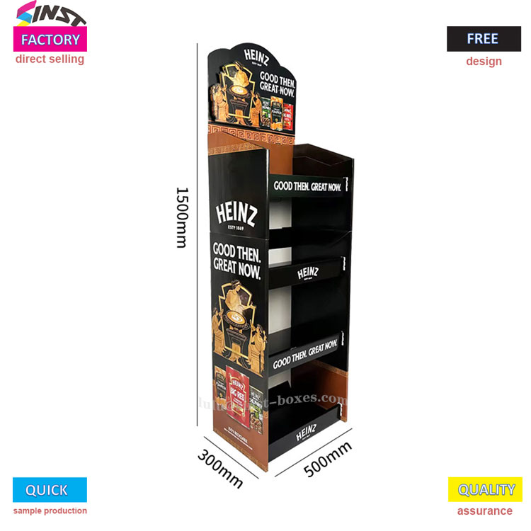 Bu domates sosu vitrin rafı, süpermarketlerin ve marketlerin sosu sergilemesi için "küçük bir yardımcıdır". Hafif ve taşıması kolay, karton kağıt vitrinden yapılmış bir tür sos vitrin rafına aittir. Ambalajından çıkarılıp tezgaha konulduğu anda kullanılabilir. Raf dört katmana bölünmüştür, her katman iki sıra domates sosu şişesini tutabilir ve yanında biraz salata sosu ve doldurulmuş tatlı ve baharatlı sos da olabilir - buna "domates sosu sergileme rafı" denir, ancak sos rafı olarak da kullanılabilir. Küçük bir süpermarketin baharat bölümüne koymak uygundur.